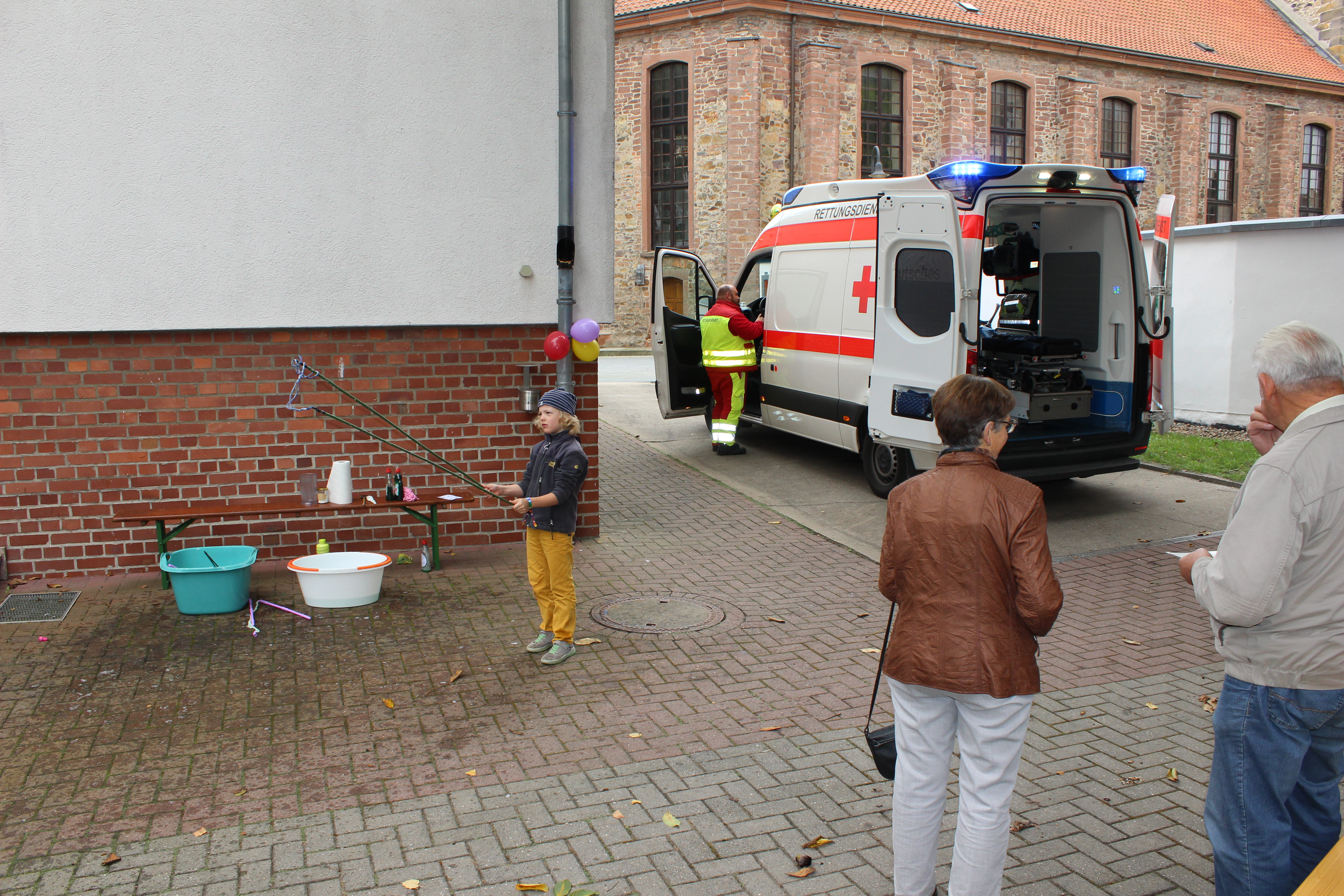 Ein weiterer Höhepunkt an diesem Nachmittag war der Besuch des Rettungswagens auf dem Fest. Geduldig beantworteten die Rettungssanitäter alle Fragen der Besucher und erklärten das Equipment des Wagens.